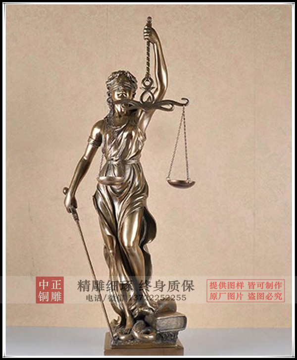 根據(jù)古希臘傳說:天庭上的眾神之間出現(xiàn)了矛盾和沖突,世界因此處于災(zāi)難的邊緣。由誰來裁判眾神之間的矛盾?血?dú)夥絼偟娜菀资艿剿膳囊T,老于世故的卻不敢仗義執(zhí)言,天上地下找遍了,最終也沒有找到合適的人選。最后,天帝身旁站起一位白袍金冠的女神,拿出一條手巾,蒙在自己眼睛上,說:我來!眾神一看,不得不點(diǎn)頭同意:她既然蒙住了雙眼,看不見爭紛者的面貌身份,也就不會受到誘惑和威脅。