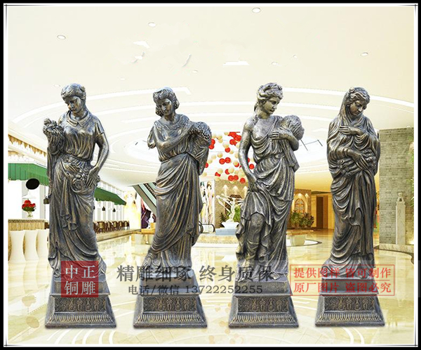 四季女神銅像雕塑,形態(tài)各異,神情豐滿,姿態(tài)優(yōu)雅,讓人們欣賞之時(shí),能感受到不同季節(jié)的變化,體會(huì)到人生如四季般,經(jīng)歷著各種挑戰(zhàn),也預(yù)示著一種順應(yīng)時(shí)代、不放棄、勇往直前的精神。