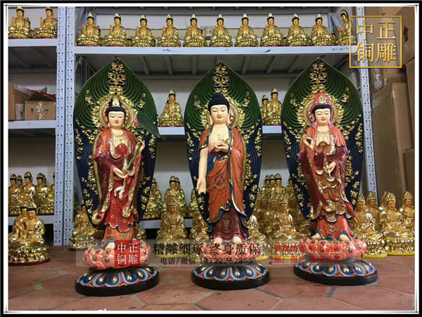在佛教中佛像的塑像有很多,很多人看到這么多的塑像,就誤認(rèn)為佛教是泛神教,而其它宗教都是一個教主,唯一的教主,一人說了算,就在佛教這比較亂。其實是因為他們不知道佛教供養(yǎng)佛像的意思,諸佛像不是代表神,而是代表了法門的。世間有無量無邊的事和理,用一種方法很難完全表達(dá),所以銅雕佛像廠家才會塑造許許多多不同的佛像方便表法。我們今天就來說說西方三圣銅像。