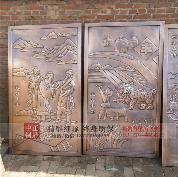 銅浮雕以不銹蝕、不脫色的優(yōu)質(zhì)紫銅為原料,經(jīng)過多道工序精制而成,在內(nèi)容和形式上與地方特色文化緊密結(jié)合,具有做工精細(xì)、形象逼真、立體感強(qiáng)、風(fēng)格古樸、畫面栩栩如生、可永久收藏等特點(diǎn)。銅浮雕選材貼近現(xiàn)實(shí)生活,是民間的藝術(shù)精靈,他展現(xiàn)著人們的思想和審美。這種浮雕制作技術(shù)流傳在民間,訴說著民間的故事。