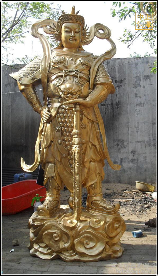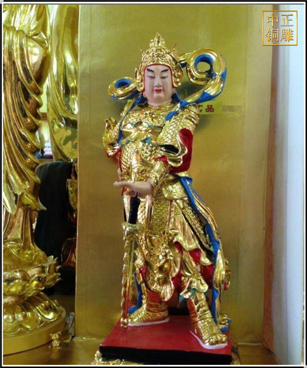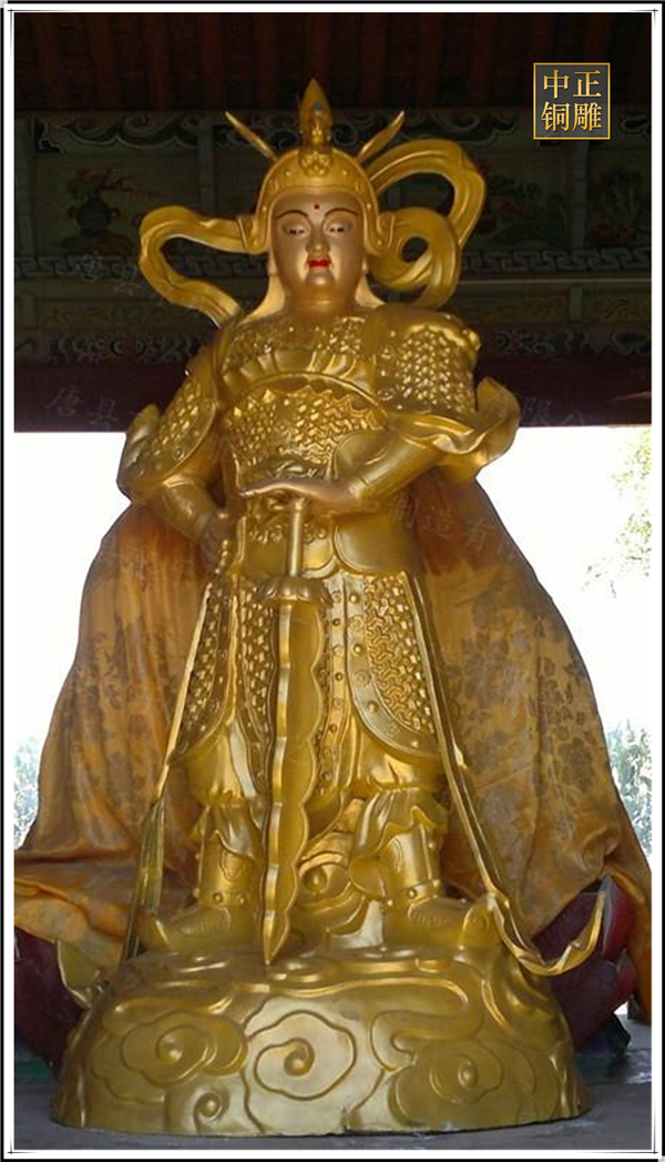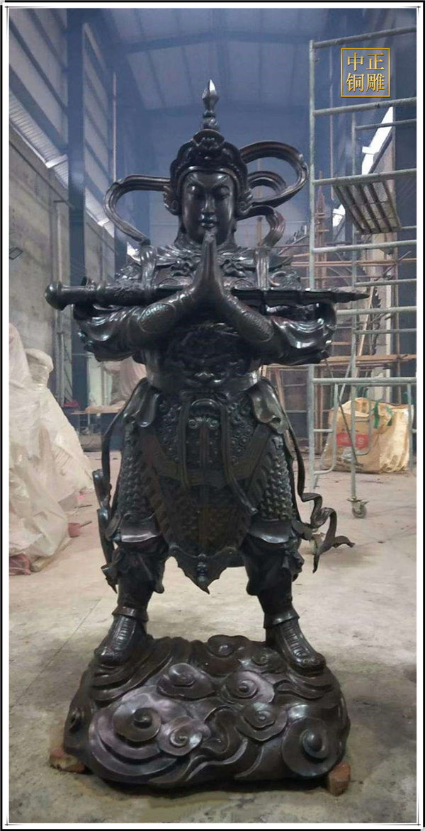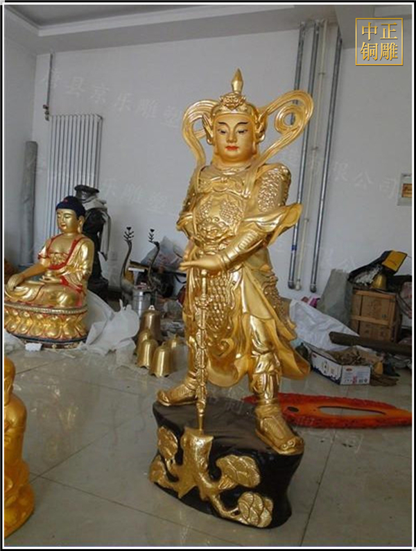 于是,韋陀被人們稱為護法菩薩。在中國的寺院殿宇里原印度血統(tǒng)的銅雕佛像韋陀已經(jīng)漢化了,成了一名地道的中國武將,英俊威武。他身披鎧甲,手持金剛杵,降魔去妖,威風凜凜。天王殿中所塑的韋陀,一般具有兩種站立的姿態(tài),一個是雙手合十,橫杵于腕上,直挺而立;一個是一手握杵拄地,另一手叉腰。