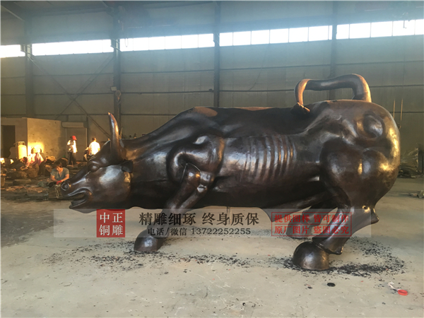 牛給人的印象,是一種溫順而踏實的動物,肯吃苦、憨厚樸實,是人類的好幫手,而銅牛雕塑的多樣造型,具有著力量與旺財?shù)南笳饕饬x,尤其在現(xiàn)代化的今天,銅牛雕塑更被賦予了開拓創(chuàng)新、積極進取、團結奉獻的精神意義,所以說,銅牛雕塑不僅僅是一種雕塑產(chǎn)品,更是一種精神的象征,能夠給人以思想上的激勵,在企業(yè)當中尤為適用。中正銅雕-華爾街銅牛雕塑廠家,定做華爾街銅牛雕塑廠家,大型華爾街銅牛雕塑廠家,唐縣中正銅雕工藝品廠是鑄銅雕塑的廠家。擁有設計師和雕塑團隊,引進的鑄造技術,開發(fā)出一系列的藝術性銅制工藝品。